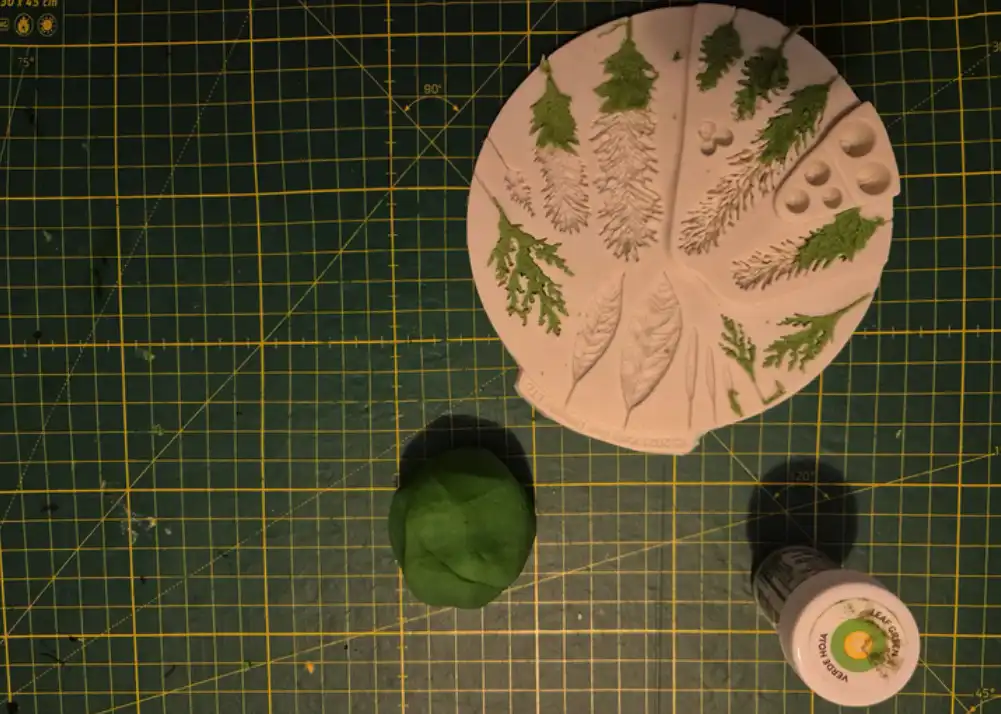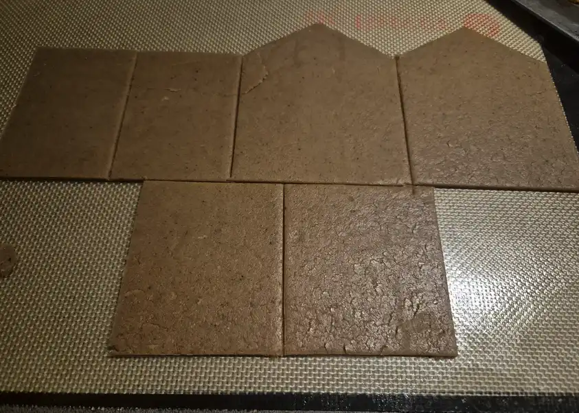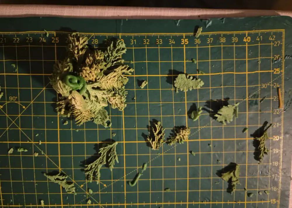 Bygge av granar. Gingerbread clay, grön gelfärg + kakao. In i ugn i ca 30 min på låg värme, så de torkar.