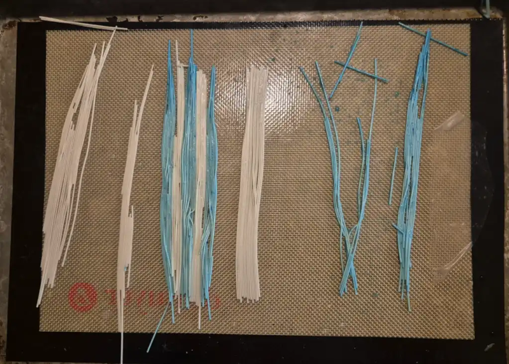 Mattbygge av tunna nudlar. De blåa nudlarna kokades separat i blå gelfärg.